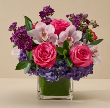 A beautiful way to bring a sweet mood to the room or table, the Berry Sweet Pie inspires a soft explosion of radiant feelings. Delectable, bright, and fragrant, these hot pink roses, purple hydrangeas, pink cymbidium orchids, and distinctive dark purple stock flowers combine to create the impression of vibrant berries.